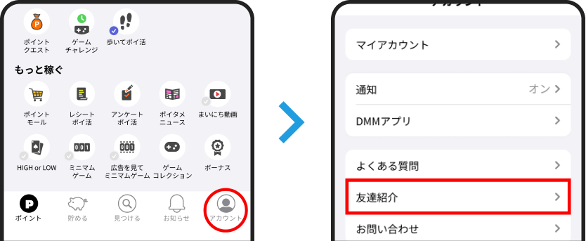 アプリ内のホーム右下の「アカウント」をタップし、遷移したアカウント画面の「友達紹介」を選択します